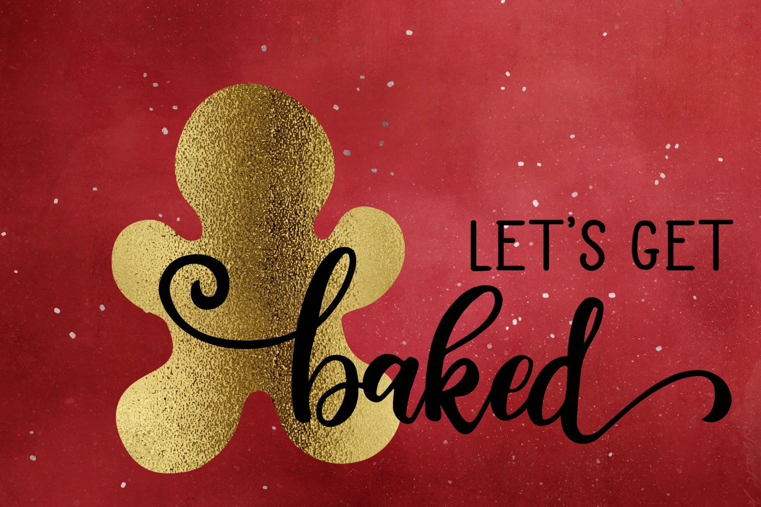 Een grappige kerstkaart met rode waterverf achtergrond en een gingerbread poppetje in goudeffect en de tekst Let's get baked. Aan de achterzijde kun je een persoonlijke boodschap schrijven.