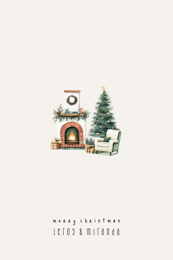 Een warme kerstkaart met een illustratie van een knusse huiskamer vol kerstsfeer. Voeg eenvoudig je eigen kerstgroet toe en maak de kaart persoonlijk.