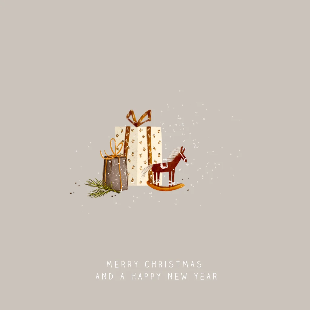 Een lieve kerstkaart met illustratie van cadeautjes en een klassiek hobbelpaardje. Personaliseer eenvoudig met je eigen tekst of achtergrondkleur. Leuk te combineren met een bijpassende sluitzegel of adressticker uit dezelfde serie.