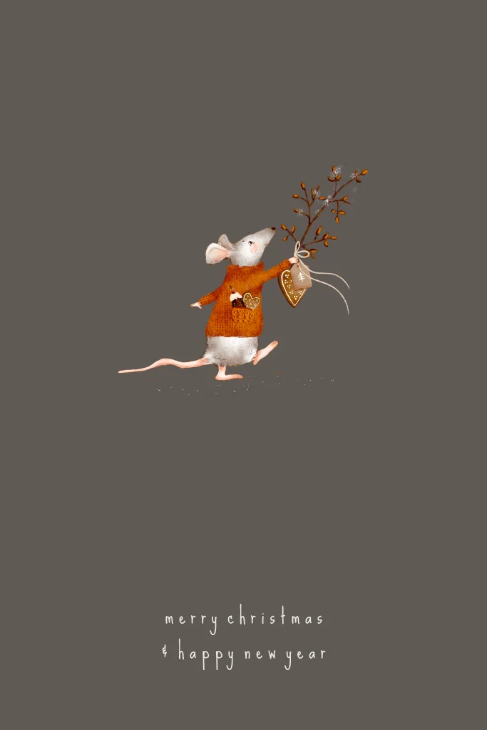 Een lieve kerstkaart met een muisje dat trots een kersttakje vasthoudt. Pas de tekst eenvoudig aan en geef de kaart een persoonlijke touch. Een lief kaartje met winterse warmte.