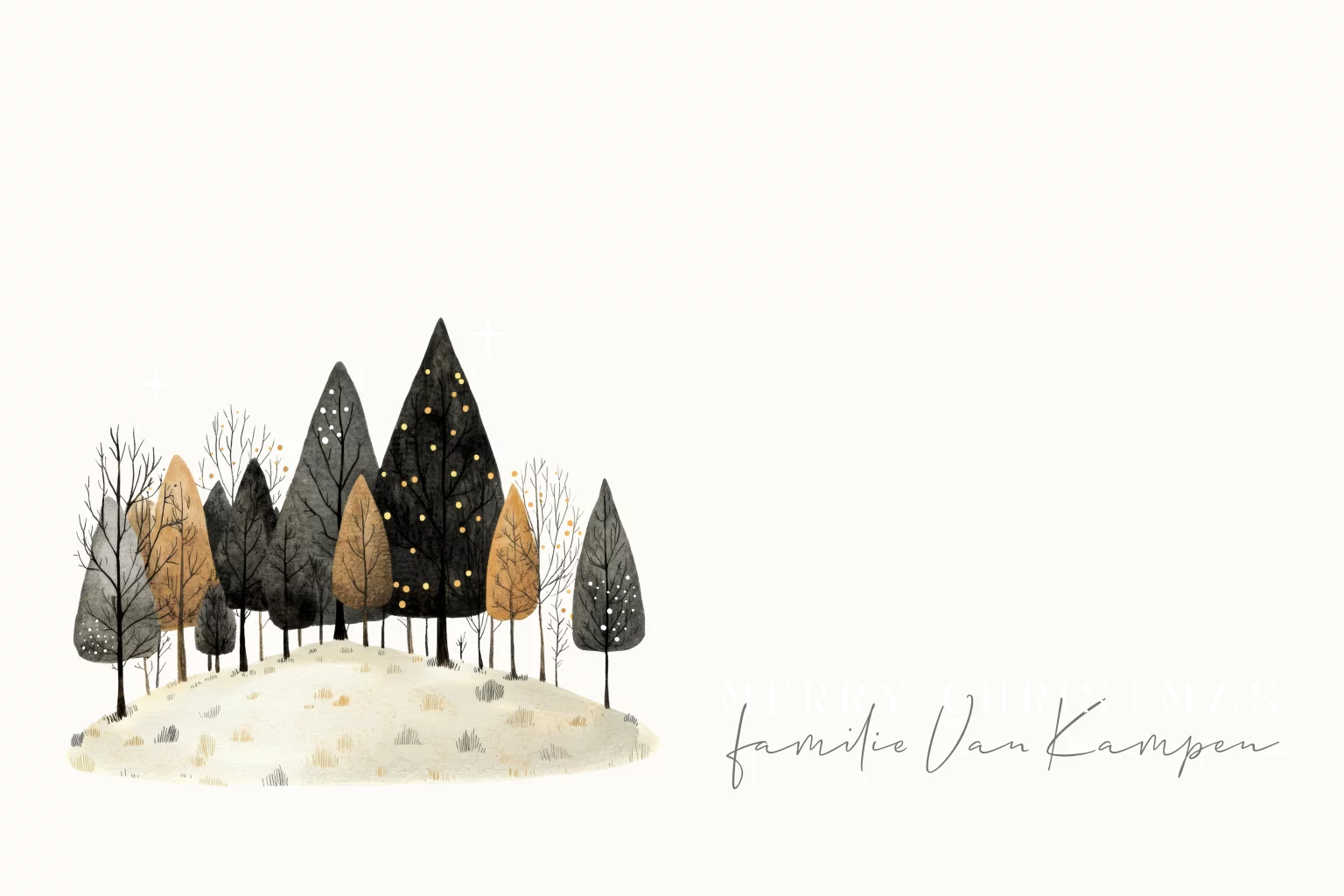 Een stijlvolle kerstkaart met een winters landschap vol bomen en goudfolie glans. Personaliseer eenvoudig met je eigen tekst of namen. Een elegant ontwerp dat de magie van kerst laat schitteren.