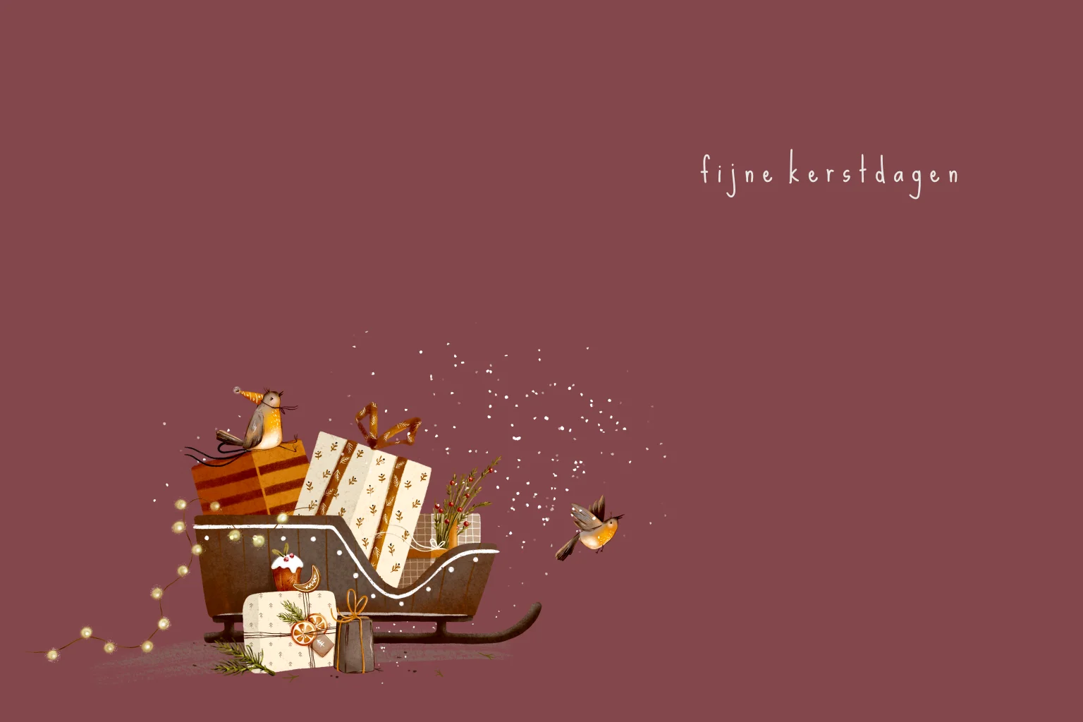 Een sfeervolle kerstkaart met een slee vol cadeautjes, vogeltjes en winterse details. De warme roodbruine tint en de fijne illustraties brengen direct het kerstgevoel in huis. Voeg op de achterkant een persoonlijke kerstgroet toe en maak de kaart helemaal eigen.