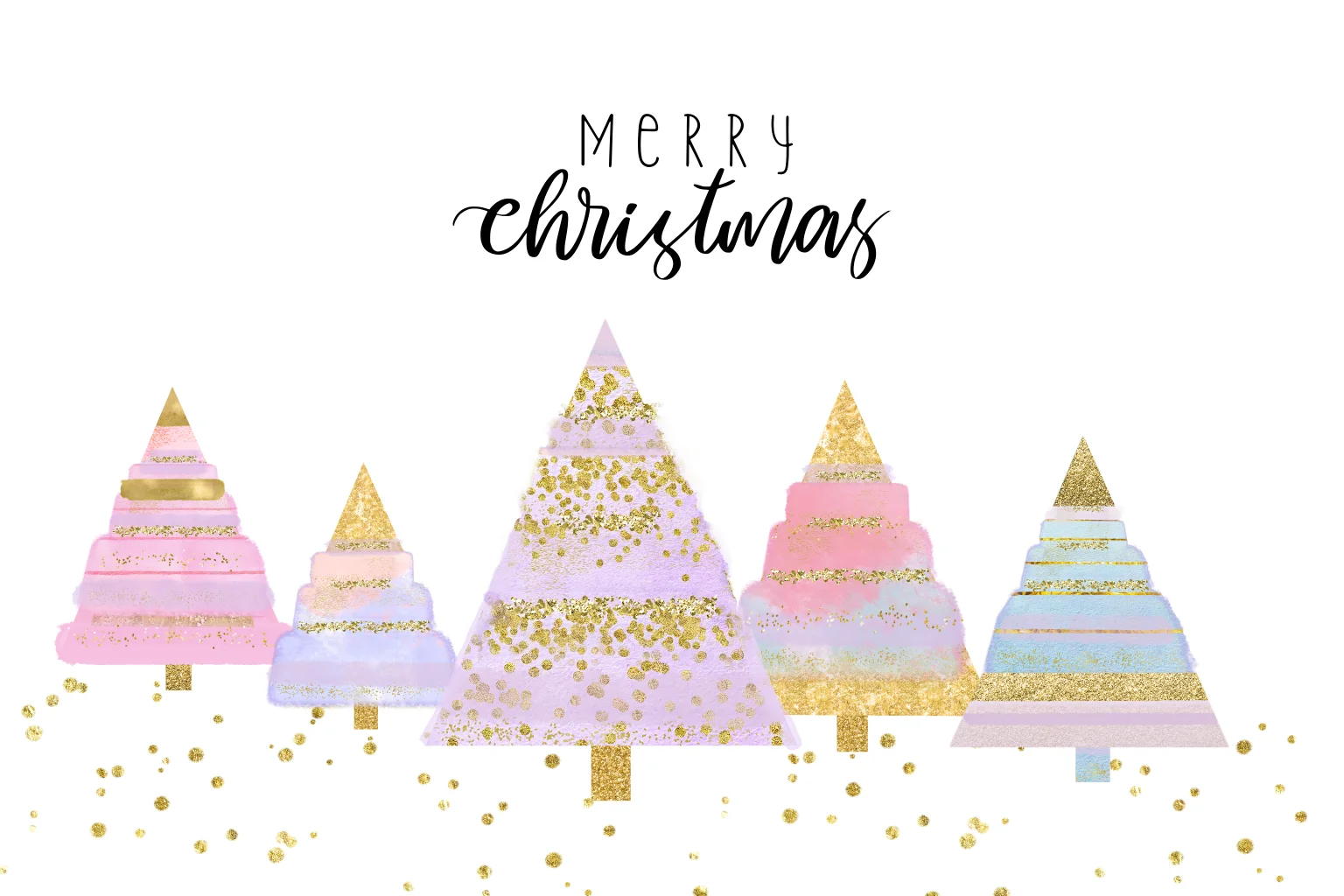 Vrolijke kerstkaart met roze, paarse en gouden kerstboompjes