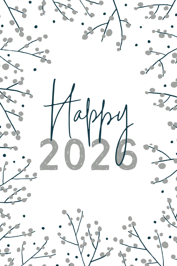 Stijlvolle nieuwjaarskaart met een modern patroon van groene en blauwe takjes. De rustige kleuren en het strakke ontwerp geven deze kaart een frisse uitstraling voor het nieuwe jaar. Pas eenvoudig de tekst en lettertypes aan en voeg op de achterzijde je eigen nieuwjaarswens toe. Zo stuur je familie, vrienden of collega’s een persoonlijke en feestelijke nieuwjaarsgroet.