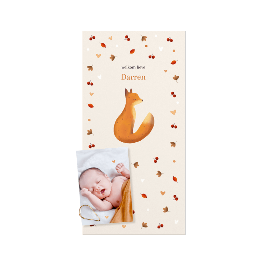 Een origineel label geboortekaartje dat bestaat uit twee delen. De rechthoekige grote kaart heeft lieve illustraties van een lief vosje met hartjes, besjes, blaadjes en takjes. Op het kleine kaartje kun je een foto van jullie kindje toevoegen. De labelkaarten kun je zelf aan elkaar bevestigen met een paperclip.