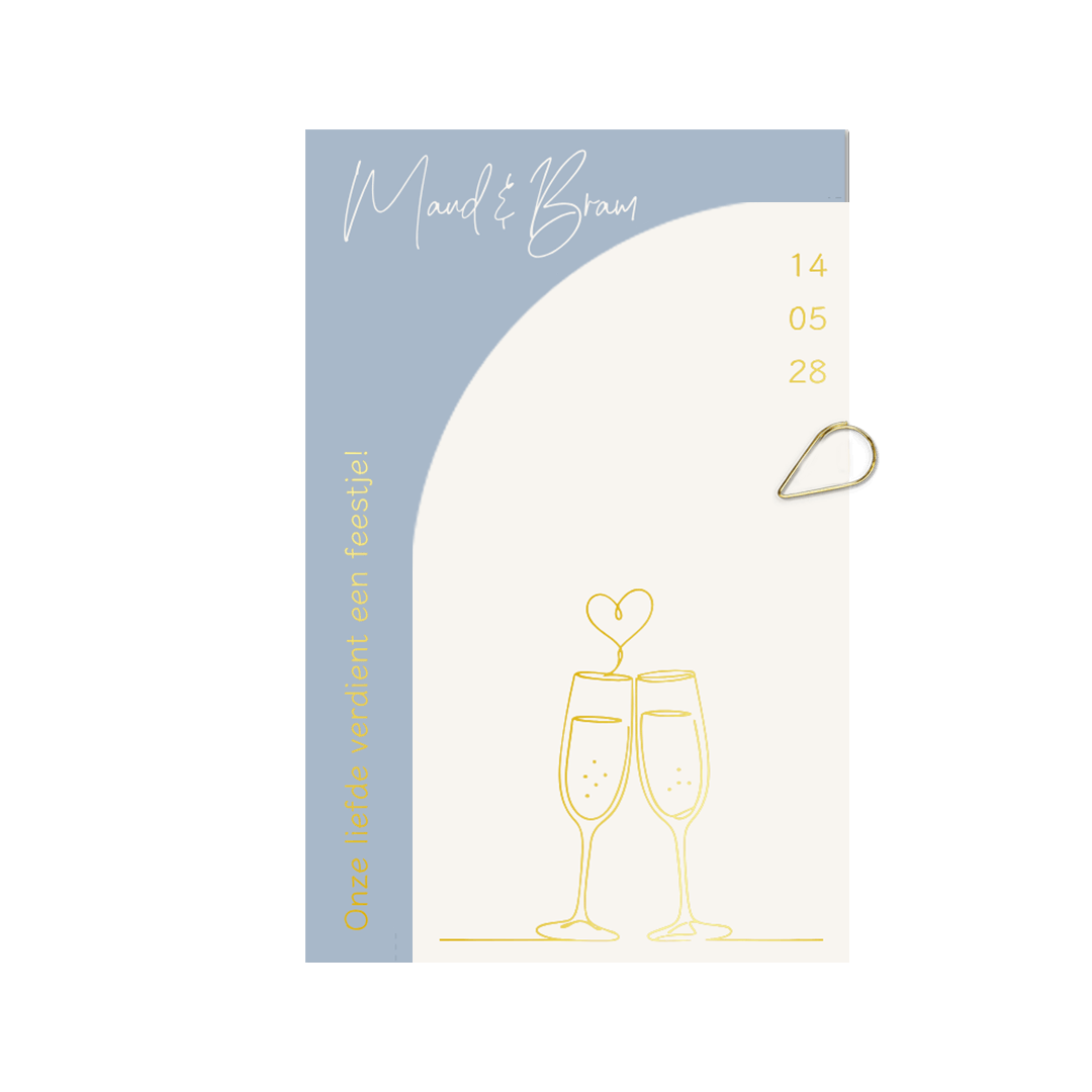 Vier jullie liefde met deze stijlvolle tweedelige trouwkaart. Het unieke ontwerp bestaat uit twee kaarten die met een elegante paperclip aan elkaar bevestigd worden. De zachte blauwtint in combinatie met het minimalistische lijnontwerp geeft jullie uitnodiging een moderne en romantische uitstraling.
