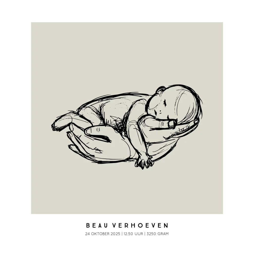 Een liefdevolle geboorteposter met een handgetekende schets van een slapende baby in een hand, op een warme beige achtergrond. Een uniek en persoonlijk kraamcadeau of een tijdloos aandenken aan de geboorte van je kindje. De tekst, achtergrondkleur en lettertype kun je eenvoudig aanpassen in de editor.