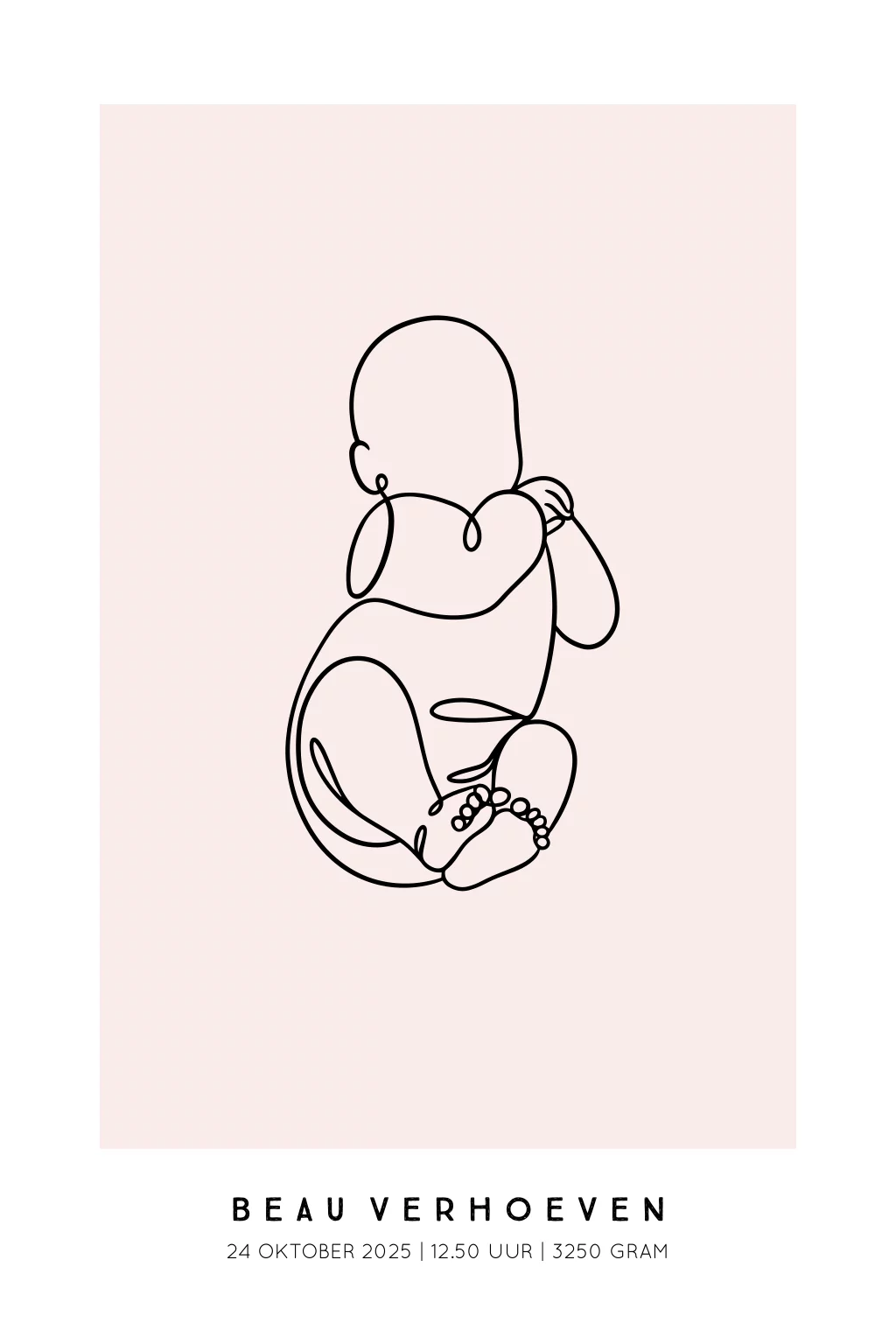 Deze geboorteposter met een zachte roze achtergrond en een minimalistische lijntekening van een liggende baby is een prachtig aandenken aan de geboorte van jullie kindje. Perfect als decoratie voor de babykamer of als uniek en persoonlijk kraamcadeau. In de editor kun je eenvoudig de achtergrondkleur, naam, geboortedatum en lettertypes aanpassen. Zo maak je een ontwerp dat helemaal past bij jullie stijl.