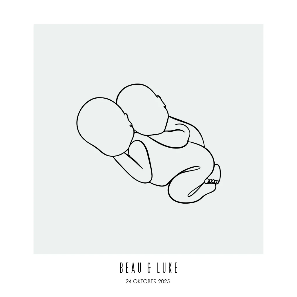Deze geboorteposter met een minimalistische lijntekening van een slapende tweeling is een prachtig en persoonlijk aandenken aan de geboorte van jullie kindjes. Perfect als decoratie voor de babykamer en een origineel kraamcadeau voor trotse ouders. In de editor pas je eenvoudig de namen, geboortedatum, achtergrondkleur en lettertypes aan, zodat het ontwerp volledig bij jullie wensen past.