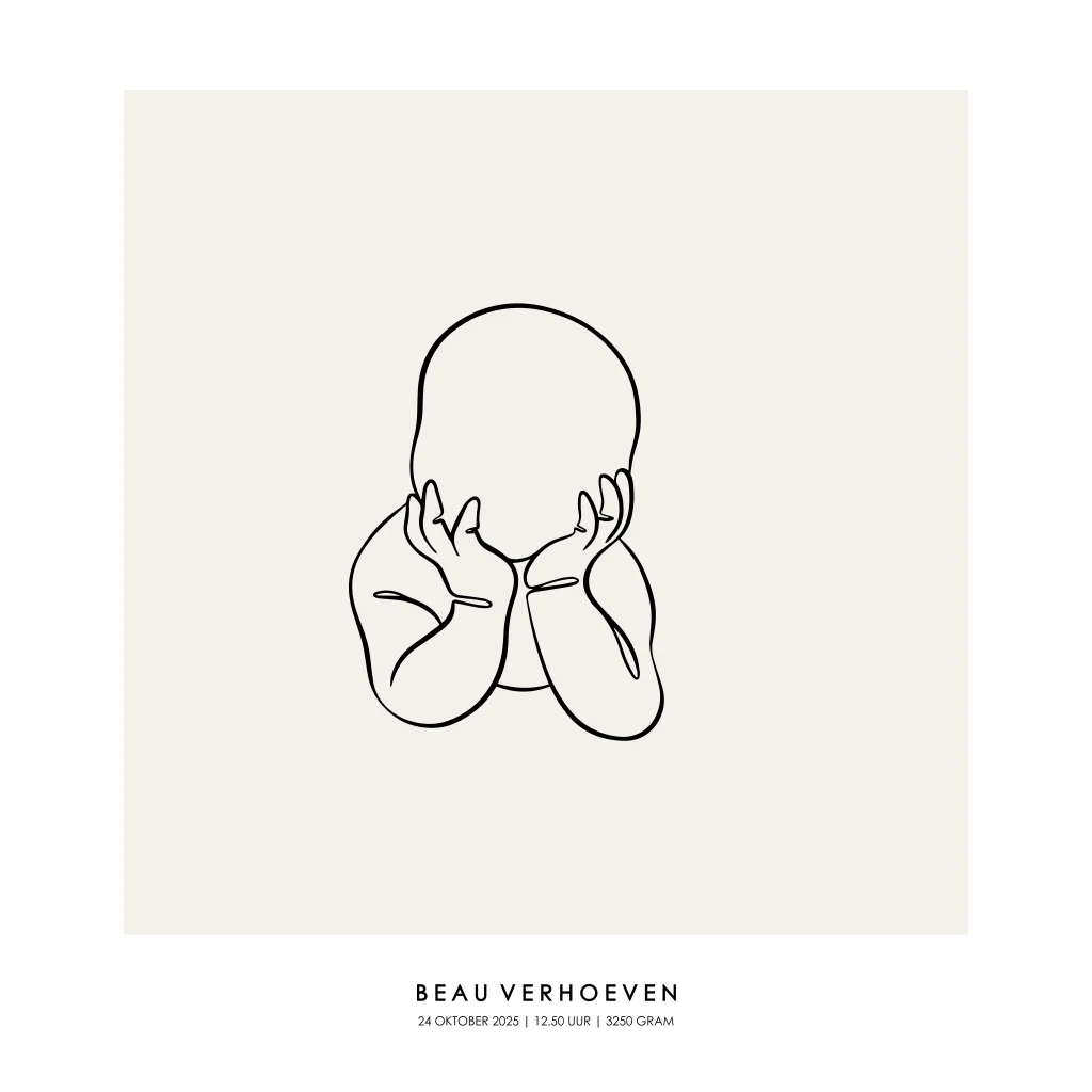 Deze lieve geboorteposter toont een baby met de handjes voor het gezicht in een elegante lijntekening. Perfect om de geboorte van een kindje te vieren of als betekenisvol kraamcadeau. Personaliseer het ontwerp eenvoudig in de editor met jullie favoriete kleur, lettertype en gegevens van de baby.