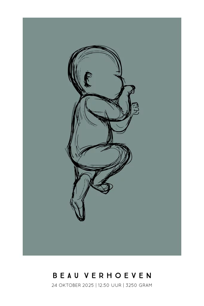 Deze geboorteposter toont een prachtige schets van een baby op een diepe donkergroene achtergrond. Een persoonlijk en tijdloos kraamcadeau dat perfect past in iedere kinderkamer of woonkamer. Voeg eenvoudig naam, geboortedatum en andere gegevens toe en creëer een uniek aandenken aan een bijzonder moment.