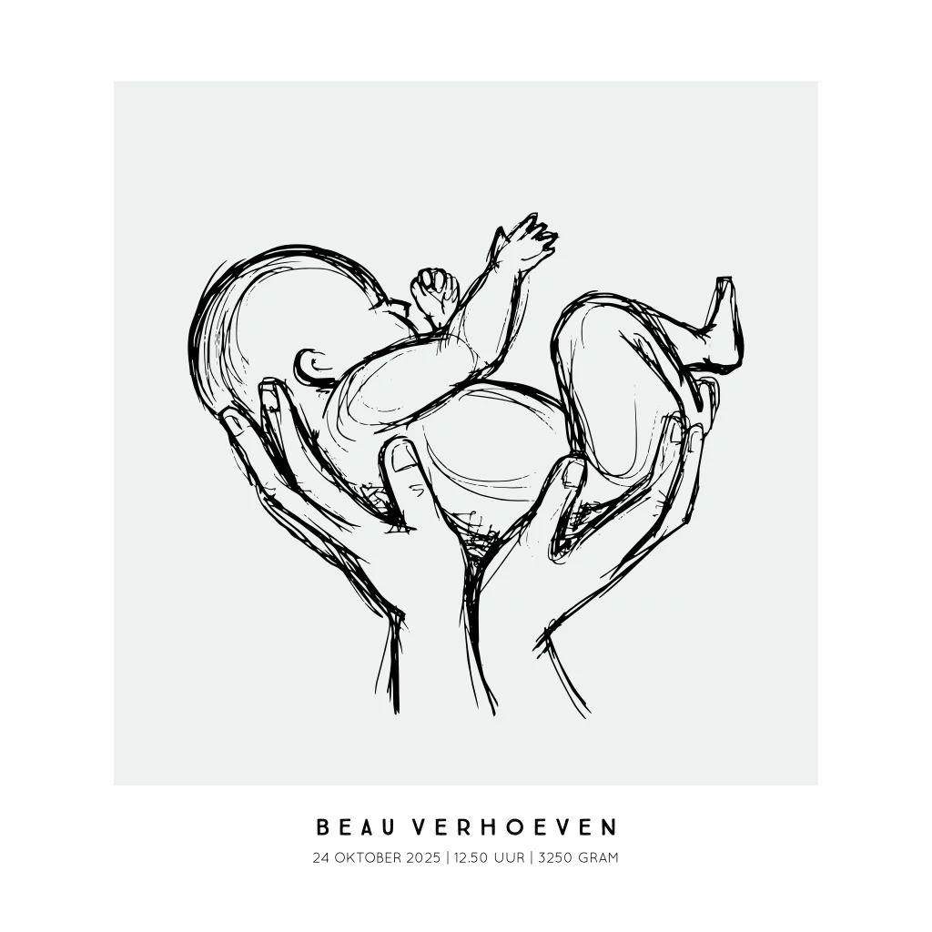 Deze unieke geboorteposter toont een liefdevolle schets van een baby in handen op een rustige groene achtergrond. Het vierkante ontwerp geeft een moderne uitstraling en maakt het een prachtig persoonlijk geboortecadeau of stijlvol aandenken aan een bijzondere dag. Je kunt de poster eenvoudig aanpassen in onze editor. Beschikbaar in meerdere kleuren en formaten.