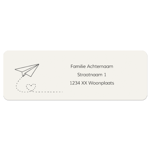 Handige adresstickers in de stijl van jullie trouwkaart met illustratie van een papieren vliegtuigje en hartje. Je kunt het design zelf aanpassen en de adressen invullen.