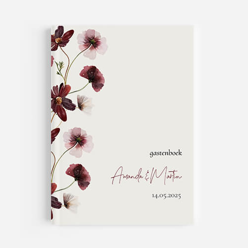 Dit gastenboek met rode en roze bloemen past mooi bij deze trouwkaart. Ontwerp eenvoudig zelf een gastenboek in de stijl van jullie trouwkaart en personaliseer het boek met jullie namen en trouwdatum.