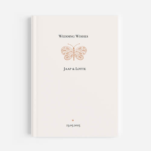 Ontwerp eenvoudig zelf een gastenboek in de stijl van jullie trouwkaart en personaliseer het boek met jullie namen en trouwdatum. De kleur van de vlinder en de lettertypes kun je eenvoudig aanpassen.