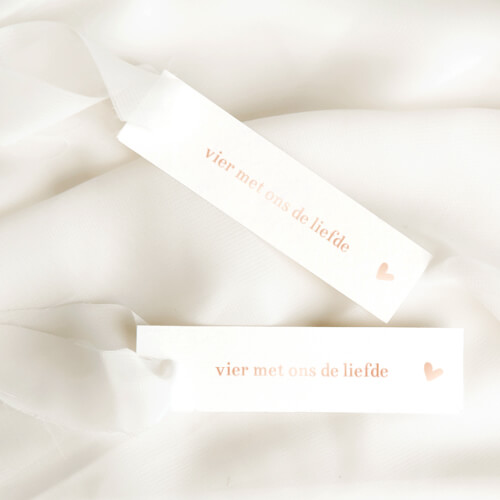 Op zoek naar prachtige labels voor jullie trouwkaarten of -bedankjes? Deze rechthoekige labels hebben een formaat van 85 x 20 mm en zijn verkrijgbaar zonder gaatjes, of met 1 of 2 gaatjes, zodat je ze gemakkelijk aan jullie creaties kunt bevestigen. De tekst Vier met ons de liefde en het lettertype zijn volledig aan te passen naar wens.