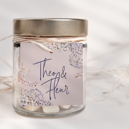 Vierkant labeltje met paarse droogbloemen. Ideaal voor het versieren van bedankjes voor jullie huwelijk. Bewerk het labeltje in de editor zodat het helemaal naar jouw wens is. Het formaat is 40 mm en het label is voorzien van een stansgaatje, zodat je het makkelijk kunt bevestigen aan een bedankje.