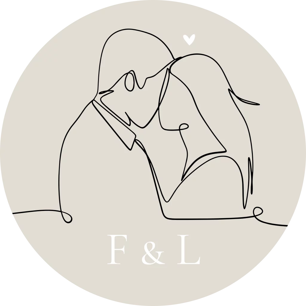 Sluitzegel voor jullie trouwkaart of -bedankjes met een lijnillustratie van een verliefd koppel op naturel achtergrond. Deze sticker kun je zelf personaliseren door bijvoorbeeld jullie initialen toe te voegen of de kleuren te veranderen.