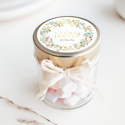 Deze sticker met kleurrijke veldbloemen en jullie namen in goudfolie is ideaal voor het versieren van trouwbedankjes in de stijl van jullie trouwkaart. Het formaat is Ø 59 mm en er zitten 12 stickers op een vel.