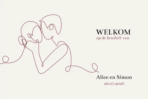 Welkomstbord bruiloft met lijntekening verliefd koppel