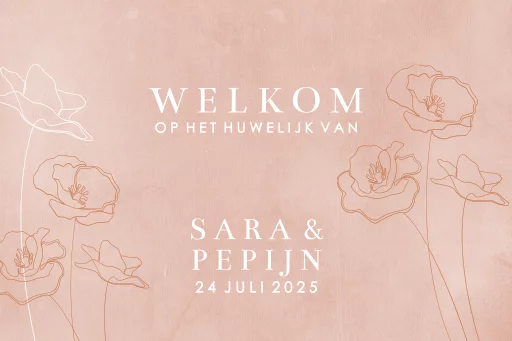 Verwelkom de gasten op jullie bruiloft met dit mooie welkomstbord in oudroze velvet met lijntekening met klaprozen. Helaas is foliedruk niet mogelijk, maar de prachtige lijntekening en subtiele pasteltinten zorgen voor een elegante uitstraling.