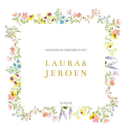 Verwelkom je gasten op de trouwlocatie met een gepersonaliseerd welkomstbord met kleurrijke veldbloemen. Personaliseer zelf het bruiloftsbord in de stijl van jullie trouwdag, zodat alles mooi bij elkaar past. Combineer met de andere items in ditzelfde thema voor een complete look van jullie grote dag.