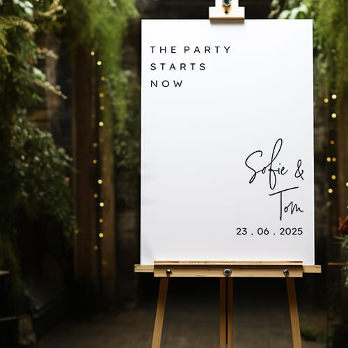 Een welkomstbord met de tekst The party starts now en jullie namen en de trouwdatum. Pas dit bruiloftsbord helemaal aan naar wens zodat het mooi past bij jullie bruiloft. Je kunt dit bord uiteraard ook gebruiken voor de tafelindeling of het dagprogramma.