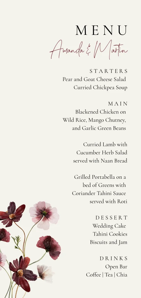Op zoek naar een prachtige menukaart voor jullie bruiloft met rode en roze bloemen? Of jullie bruiloft nu een bohemian, botanische of klassieke stijl heeft, deze menukaart past bij elk seizoen en kun je geheel naar wens aanpassen. Met een minimum oplage van 5 menukaarten kunnen jullie precies bestellen wat jullie nodig hebben voor jullie gasten.