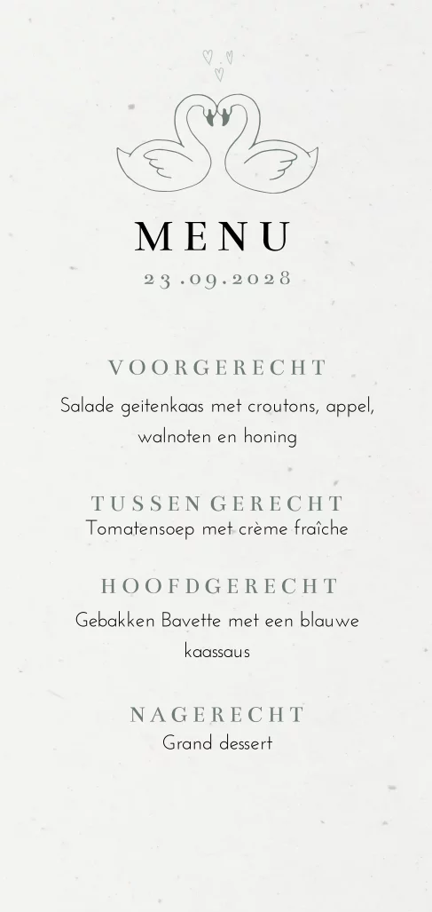 Een menukaart uit onze duurzame collectie trouwkaarten. Met een lijntekening van twee verliefde zwanen met hartjes bijpassend bij deze duurzame trouwkaart.