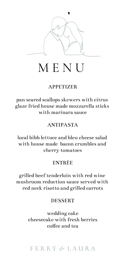 Deze menukaart met lijntekening van een verliefd koppel is perfect om het menu van jullie huwelijksdiner of -lunch op te vermelden. Met eenvoudig aanpasbare kleuren, teksten en lettertypes in onze online editor, kunnen jullie de kaart helemaal naar wens personaliseren.