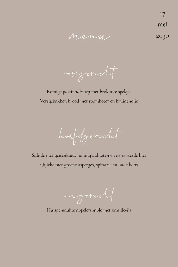 Stijlvolle menukaart die perfect aansluit bij jullie trouwkaart. Personaliseer eenvoudig het menu, de datum en kleuren, zo vormt alles een mooi geheel op de dag zelf.