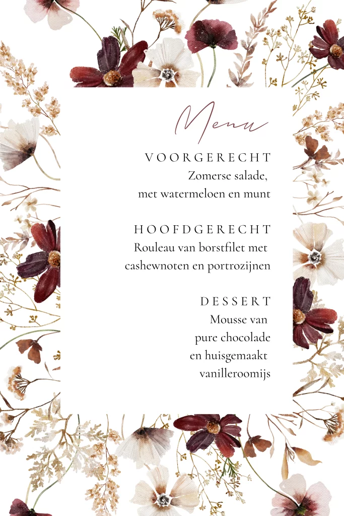 Romantische menukaart met droogbloemen waarop jullie het menu van jullie huwelijksdiner of -lunch kunnen vermelden. Mooi te combineren met de bijpassende save the date kaart en trouwkaart.