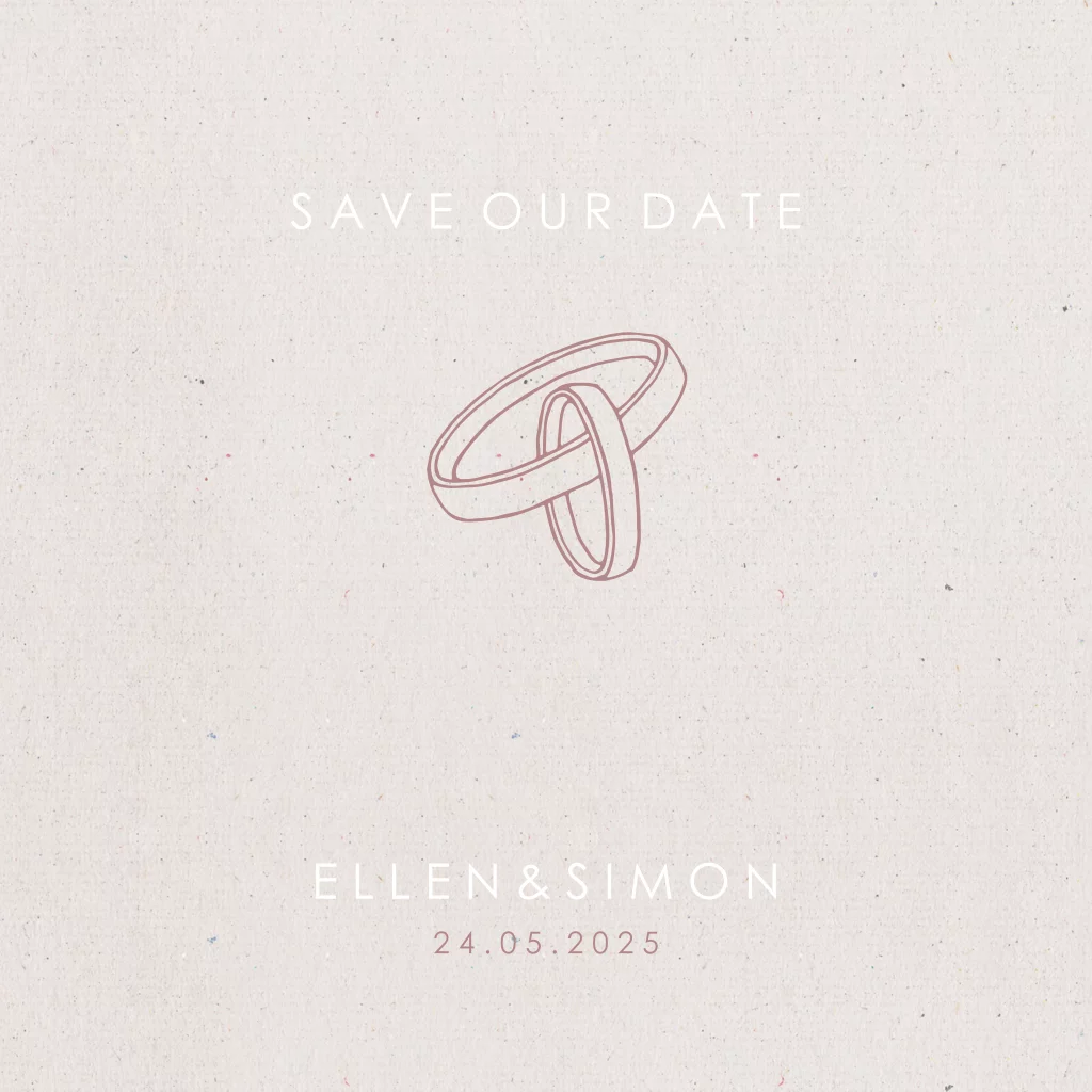 Deze minimalistische save the date kaart met op de voorzijde een illustratie van twee trouwringen is een mooie aankondiging van jullie grote dag. De naturel achtergrond en zachte kleuren geven de kaart een rustige uitstraling. Wil je een andere achtergrond kleur of een ander lettertype ? Dit kaartje kun je zelf naar wens aanpassen. Kom je er niet uit of heb je vragen? Neem gerust contact met ons op, wij helpen je graag!