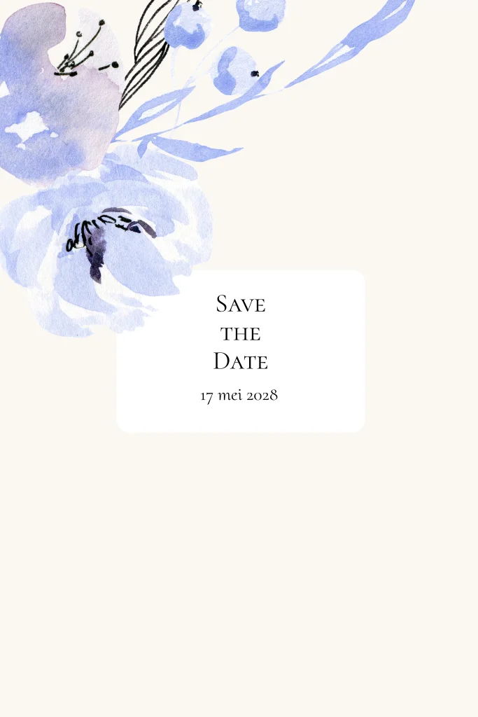 Maak jullie trouwdatum bekend bij jullie vrienden en familie met deze stijlvolle save the date kaart met waterverf bloemen in blauw en paars. We hebben ook een bijpassende trouwkaart.