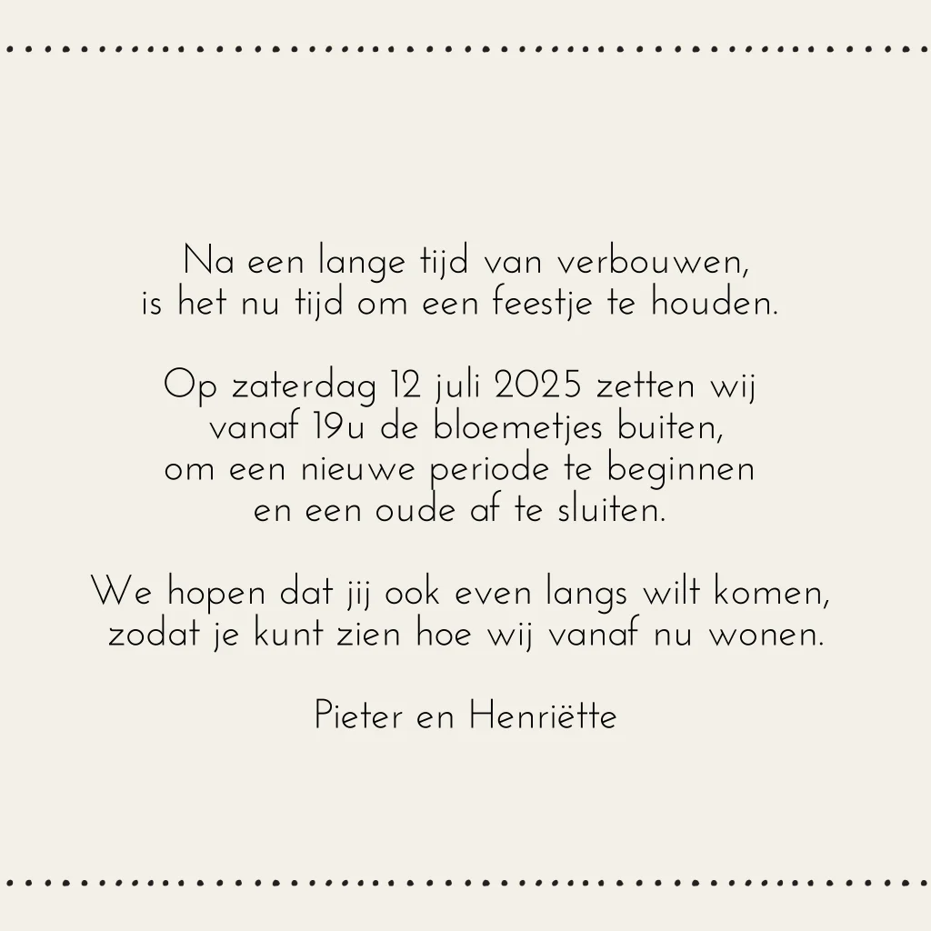 Een trendy uitnodiging voor je housewarming of om als verhuiskaart te gebruiken. Op de voorzijde staat de tekst New Home in sierlijke letters. Erg mooi te combineren met de biotop enveloppen.