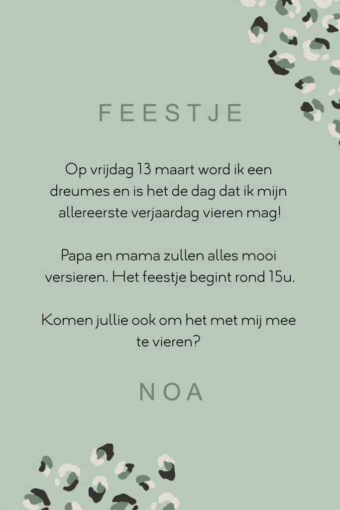 Nodig familie en vrienden uit voor een eerste verjaardag met deze hippe uitnodigingskaart met panterprint. De groene achtergrondkleur kun je naar wens aanpassen.