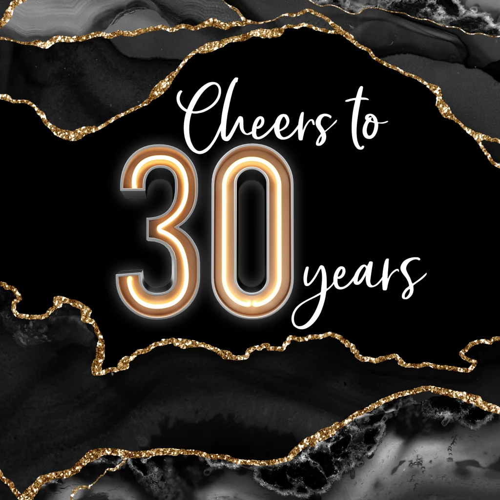 Feestelijke uitnodiging cheers to 30 years marmer zwart en goud