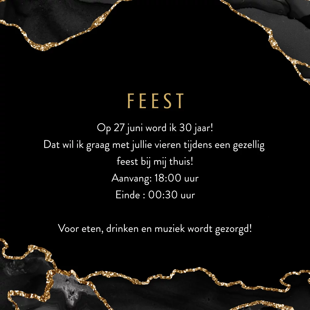 Je wordt 30 jaar! Dat moet natuurlijk gevierd worden met een gezellig verjaardagsfeest. Nodig je gasten uit met deze feestelijke uitnodiging met marmer motief in zwart en goud. Op de voorzijde de tekst Cheers to 30 years.