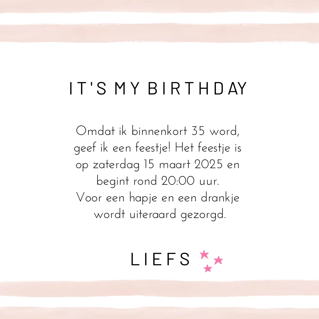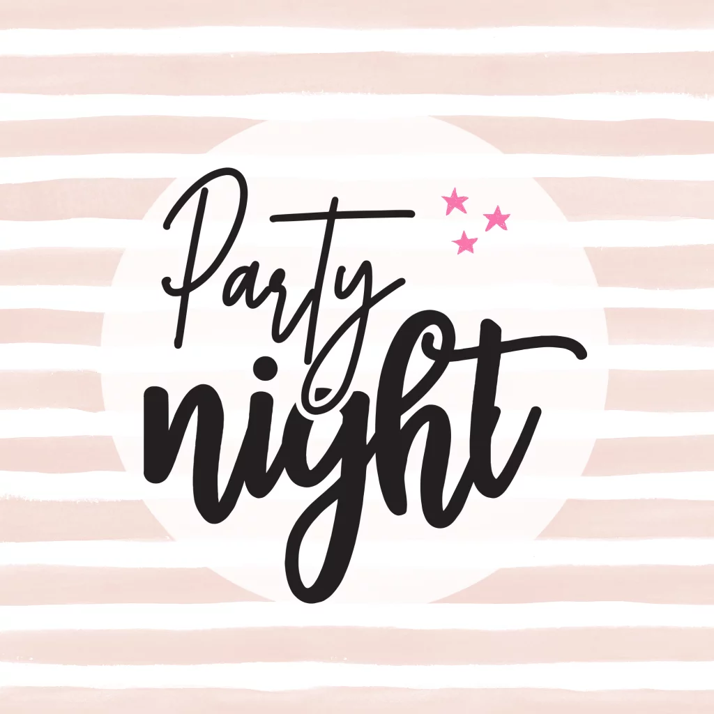 Een trendy uitnodiging met roze waterverf strepen. Op de voorzijde staat de tekst Party Night. De kleur van de roze sterretjes kun je aanpassen naar wens. Maak de uitnodiging extra persoonlijk door de kaart te bewerken in de editor.