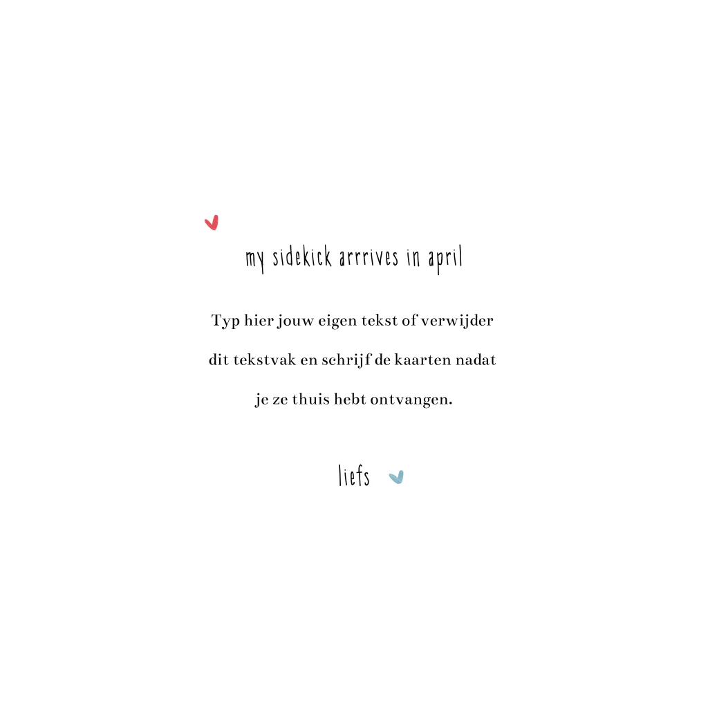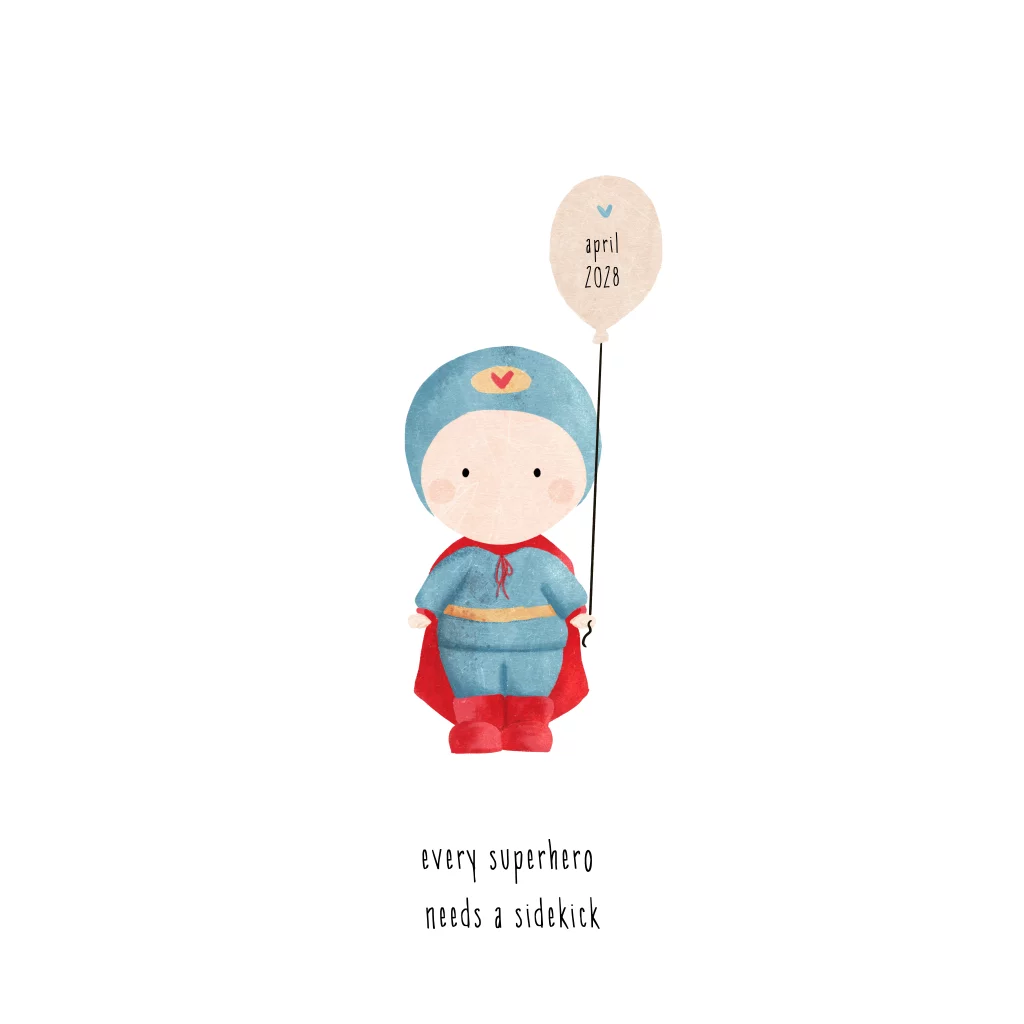 Elke superheld heeft een sidekick nodig en jouw zwangerschapsaankondiging verdient een kaartje dat net zo speciaal is. De tekst Every superhero needs a sidekick kun je eenvoudig aanpassen net als de uitgerekende datum van jullie kleine spruit.