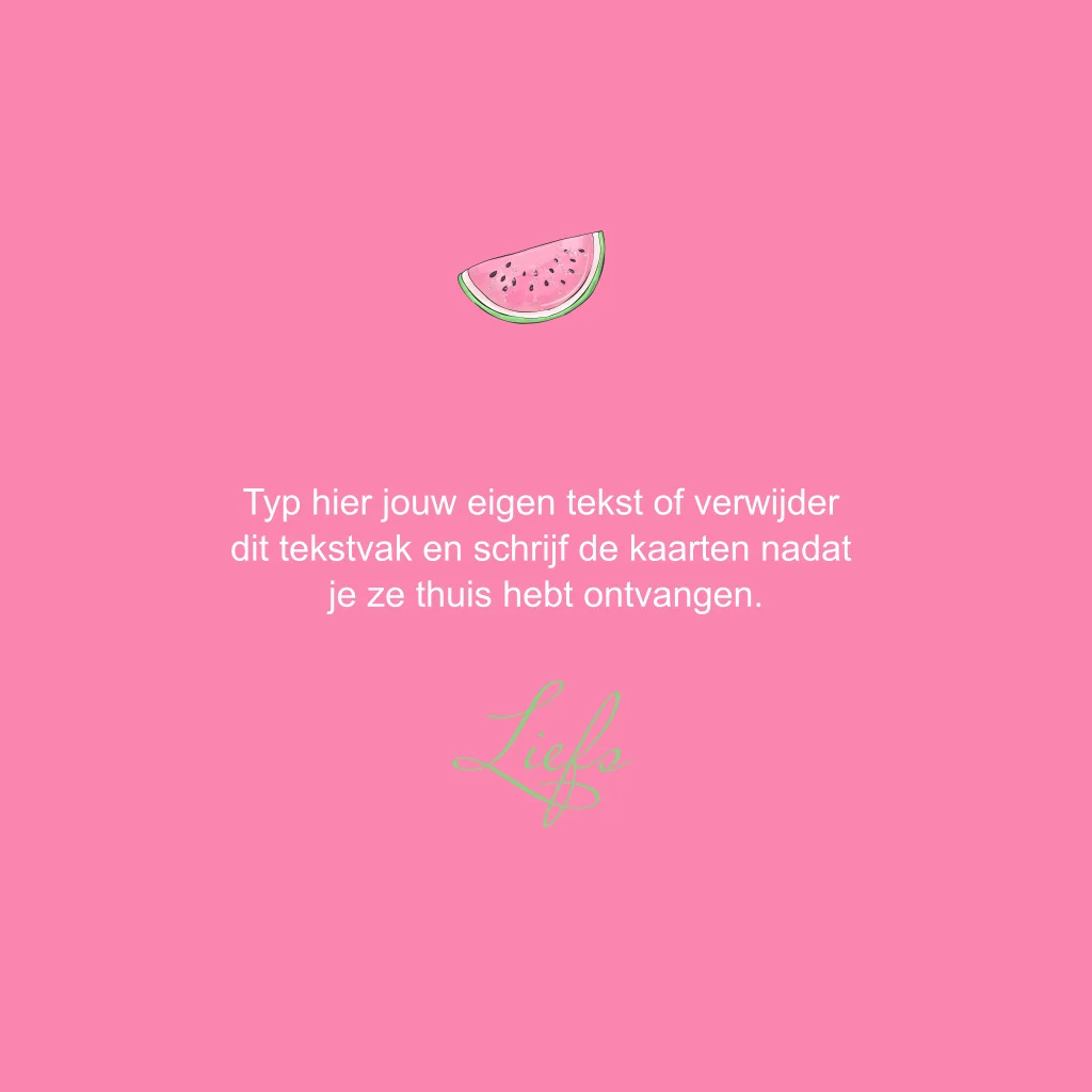 Een vrolijke kaart met de tekst You're one in a melon. Om zomaar iemand mee te verrassen of om iemand te bedanken. Voeg eenvoudig een persoonlijke boodschap toe aan de binnenzijde.