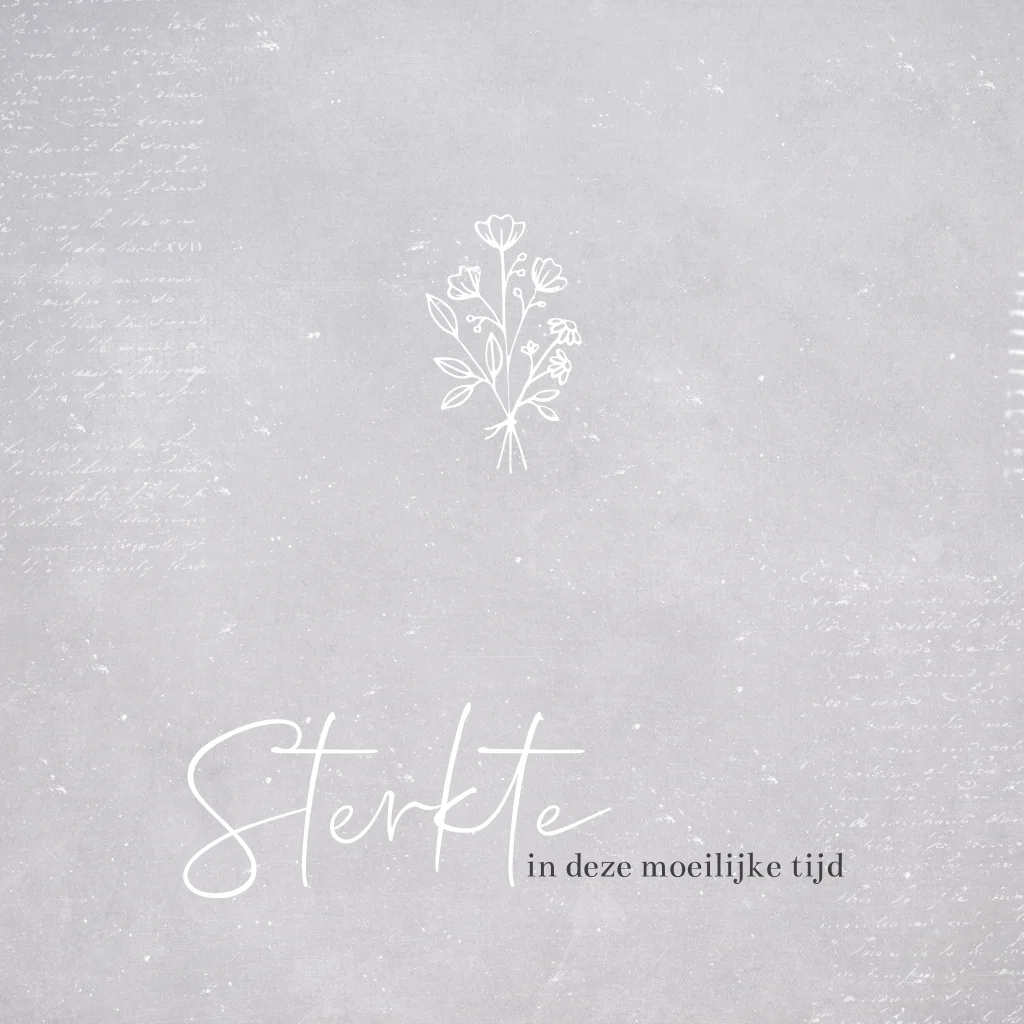 Een mooie condoleancekaart om iemand veel sterkte te wensen. Met grijze achtergrond en bloemetje. De lettertypes en de tekst Sterkte in deze moeilijke tijd kun je eenvoudig aanpassen in de editor. .