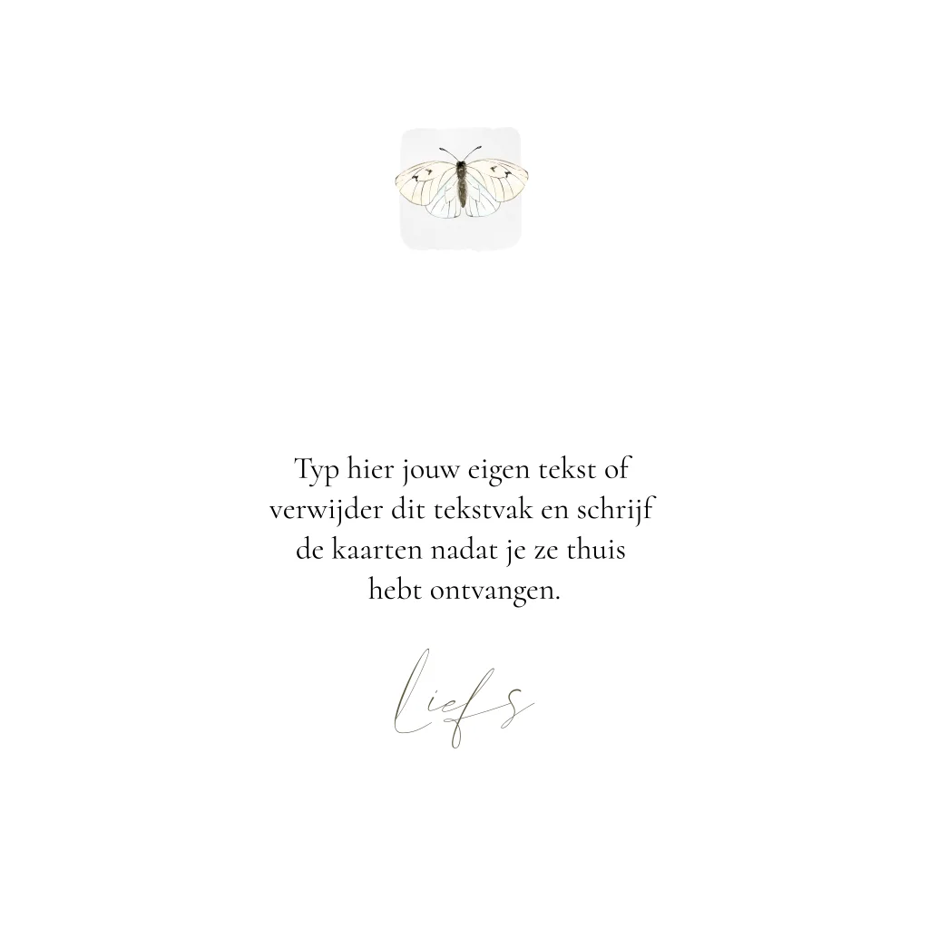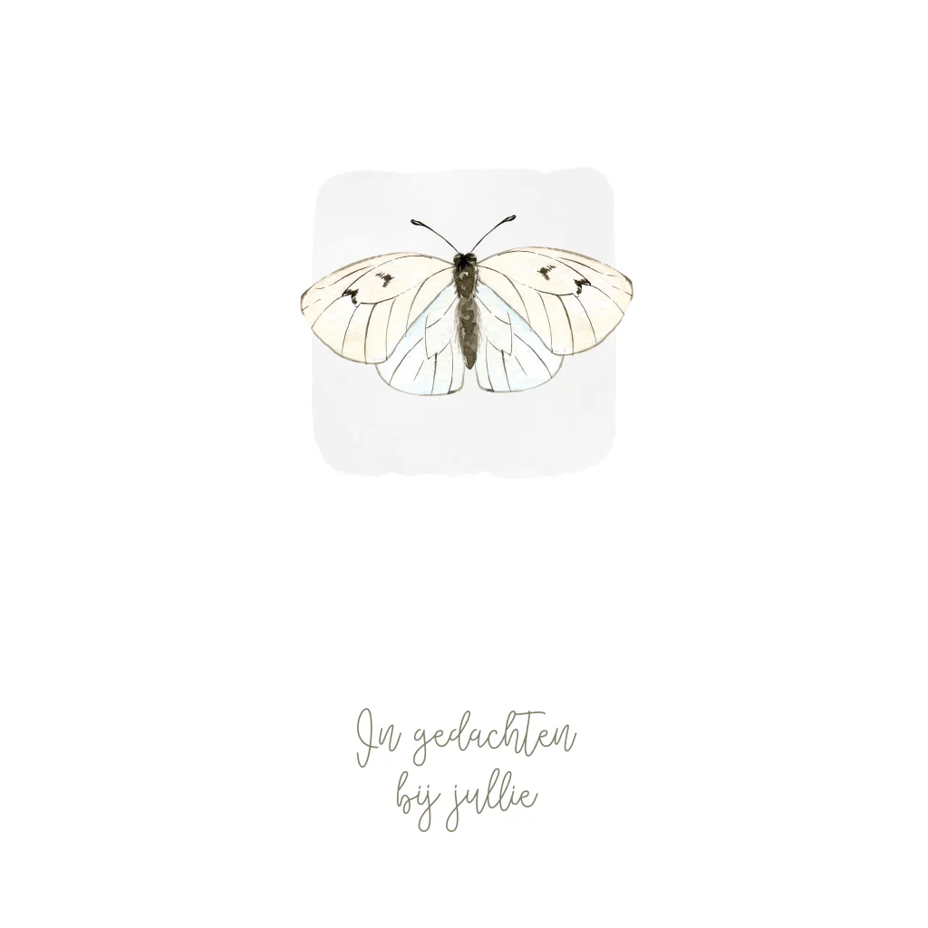 Een mooie condoleancekaart om te laten weten dat je aan iemand denkt. Op de voorzijde een vlinder geschilderd in waterverf in grijs en wit en de tekst In gedachten bij jullie.. Aan de binnenzijde kun je een persoonlijke boodschap schrijven.