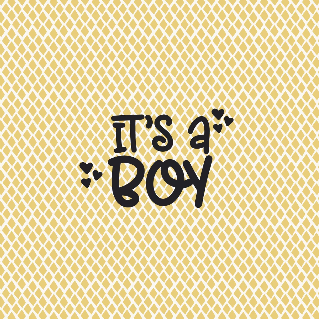 Een vrolijke wenskaart voor de geboorte van een zoon met de tekst It's a boy. Met okergele driehoekjes en lieve hartjes.