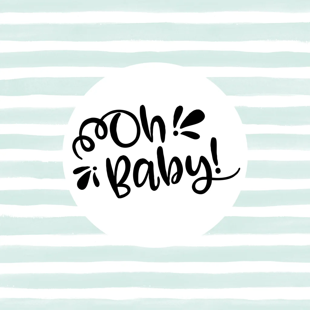 Vrolijke wenskaart om iemand te feliciteren met de geboorte van hun kindje. Met waterverf strepen in mintgroen en de tekst Oh Baby! Aan de binnenzijde kun je een persoonlijke boodschap schrijven voor de trotse ouders.