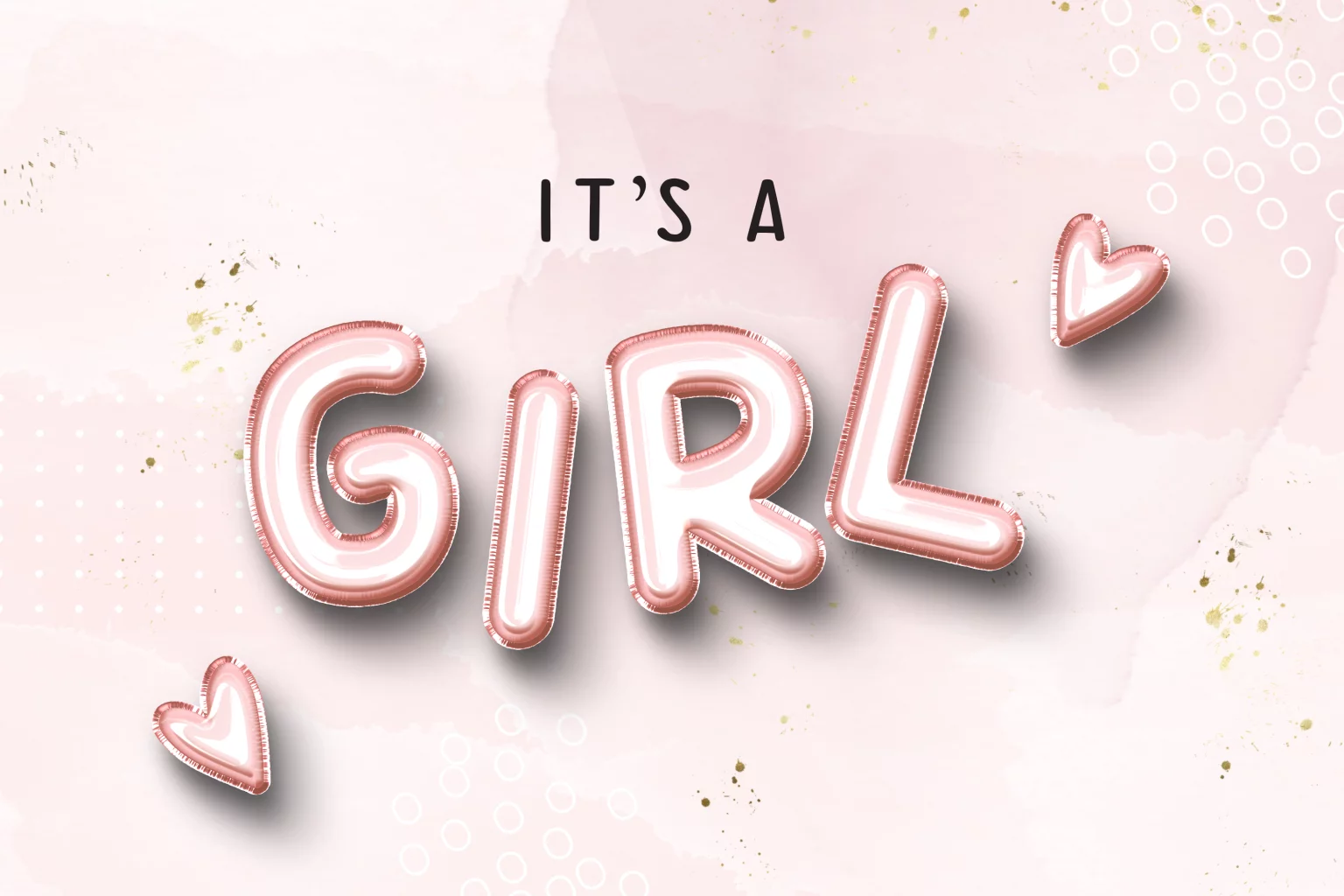 Vrolijke wenskaart om iemand te feliciteren met de geboorte van hun dochter. In roze met goudkleurige spetters en tekst in roze ballonnen. Op de voorzijde staat de tekst It's a girl, aan de binnenkant kun je een persoonlijke felicitatie schrijven voor de kersverse ouders.