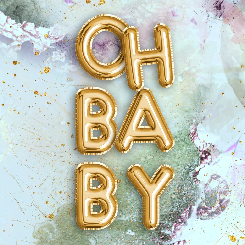 Hippe felicitatiekaart voor de geboorte van een zoon of dochter. Met goudkleurige ballonletters Oh baby. Aan de binnenkant kun je een persoonlijke boodschap schrijven voor de trotse ouders of grootouders.