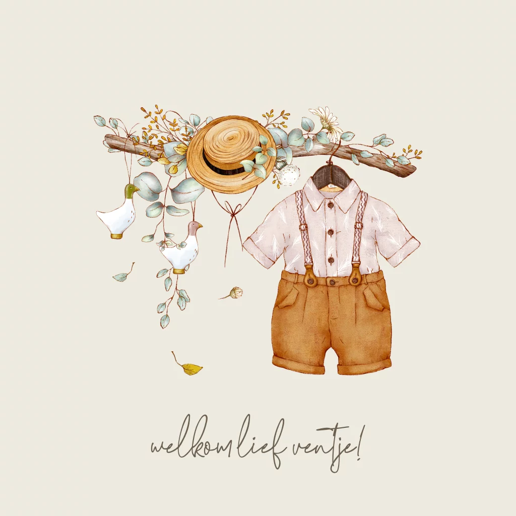 Met een lieve illustratie van babykleertjes, hoed en gansjes hangend aan een tak. De teksten, lettertypes en de kleuren kunnen eenvoudig aangepast worden in de online editor.