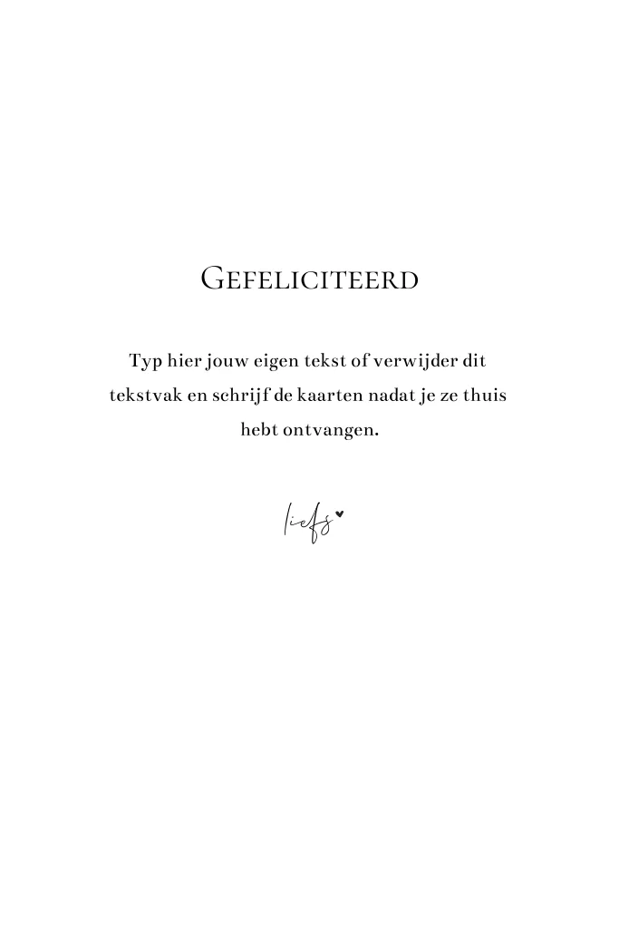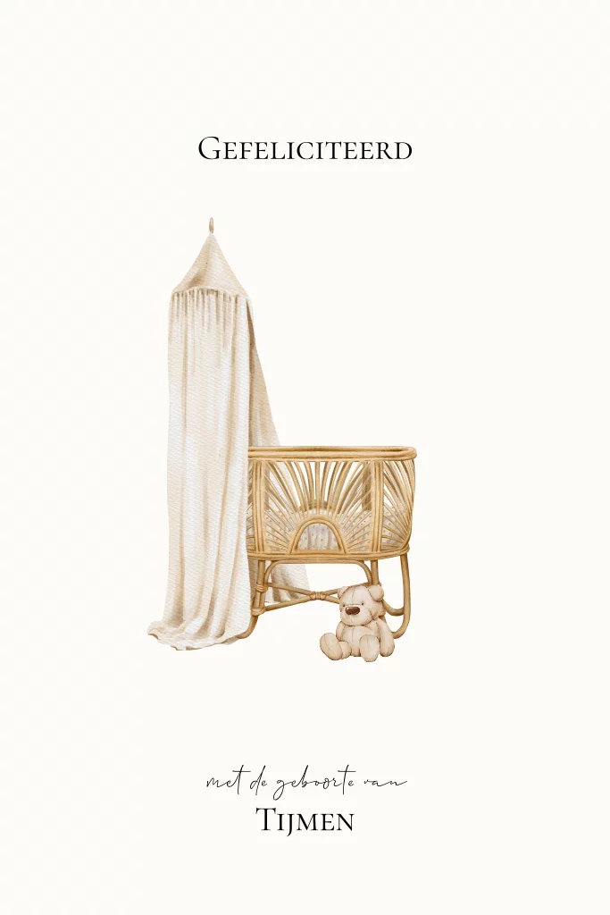 Feliciteer de trotse ouders met de geboorte van hun zoon of dochter. Op de voorzijde een illustratie van een ledikantje met knuffelbeer. Pas de tekst eenvoudig aan in de editor. Aan de binnenkant kun je een persoonlijk berichtje schrijven.