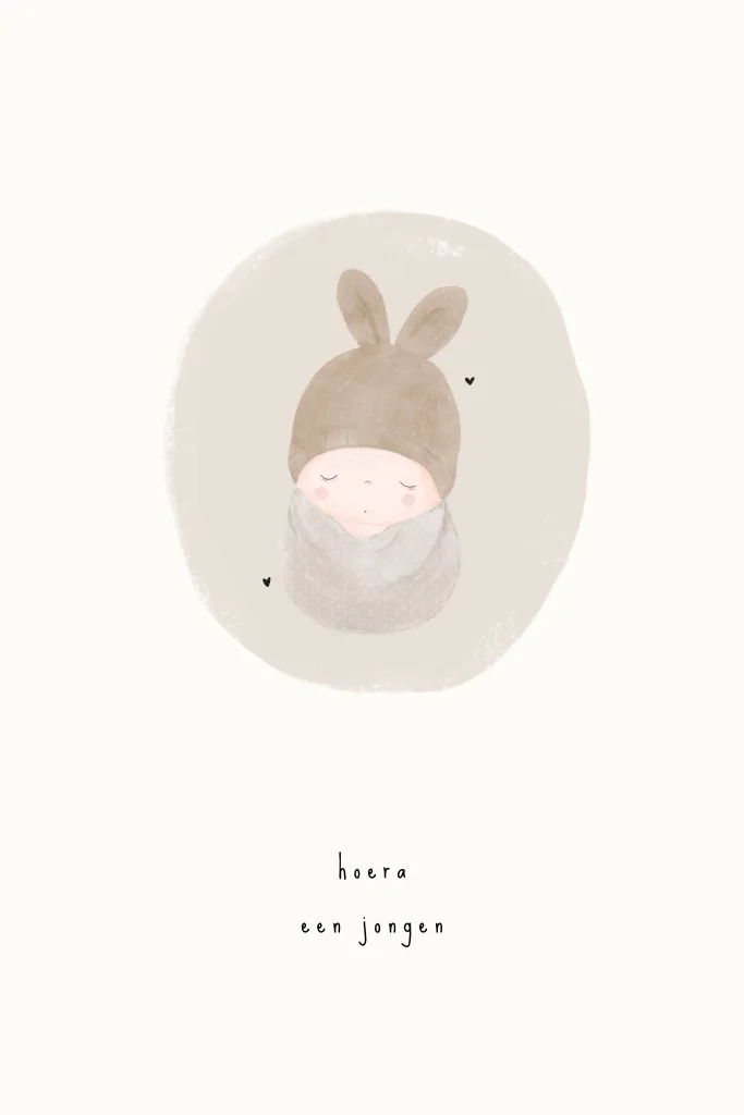 Feliciteer de kersverse ouders met de geboorte van hun zoontje met dit lieve felicitatiekaartje met schattige illustratie van een kindje met mutsje. Pas de tekst Hoera een jongen eenvoudig aan in de editor. Aan de binnenkant kun je een persoonlijk berichtje schrijven.
